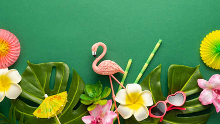 Exotic tropical summer background. Summer beach party concept. Pink flamingo, tropical leaves, orchid flowers and other accessories on green background. Flat lay, copy space.