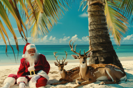 Santa Clause and his reindeers on a tropical exotic island, seacoast or beach landscape in the background, unusual funny Christmas photo for banner, article, advertisement, AI generated