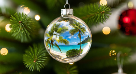 Tropical beach reflects off ornament holiday tree background