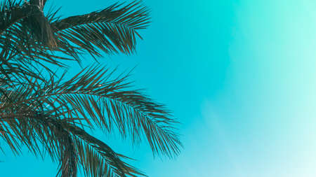 Palm leaves background. Tropical palm branch against the background of clear sky.