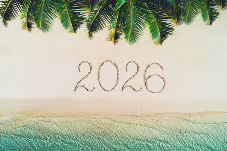 Number 2026 written in sand on a sun drenched tropical beach with clear blue ocean