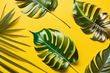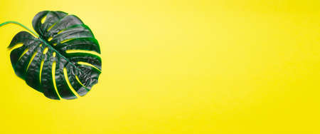 Summer concept. Green leaves Monstera on yellow background. Flat lay, top view, copy space