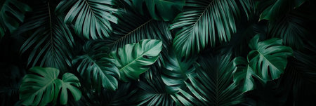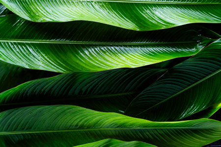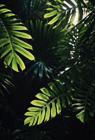 Lush Greenery and Vibrant Tropical Foliage Background with Abstract Emerald Tones and Shadows