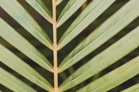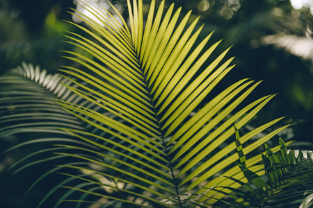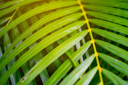 Close up shot of wild green palm branch. Tropical rainforest vegetation and botanicals plants