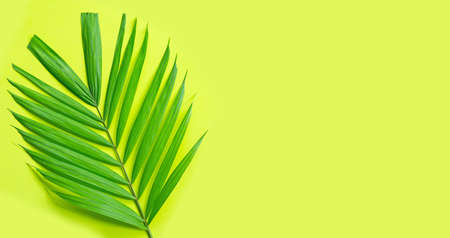 Still life colour photo palm leaf on yellow background top view flat layout