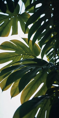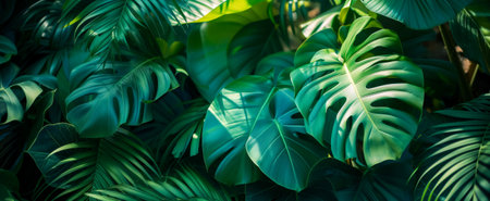 Vibrant green tropical leaves with sunlight highlighting their textures and shapes