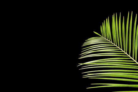 Green palm tree branch with long leaves. Isolated on black background.