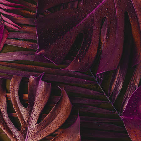 Contemporary night neon lighting and monstera leaves and exotic tropical plants.