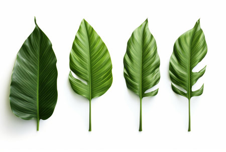 A variety of tropical leaves in different shapes and sizes stand out against a white background, highlighting their rich greens and textures for a fresh aesthetic.