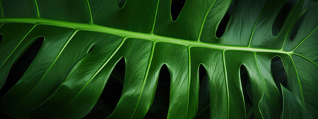 Close-up of vibrant Monstera leaf, rich texture and color.