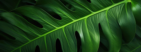 This image showcases a close-up view of vibrant green Monstera leaves with their distinctive patterns. The leaves are textured with a dark green coloration, creating a natural feel. The composition emphasizes the details of the plant life, ideal for various design and decorative purposes.
