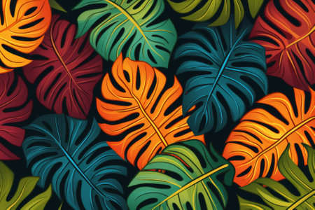 A stunning arrangement of vibrant tropical leaves adorned with water droplets, set against a colorful background, offering a fresh and lively aesthetic ideal for nature-themed projects.
