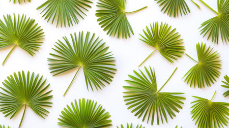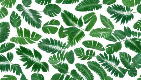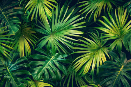 Vibrant green palm leaves overlapping create a rich, textured backdrop, capturing the lushness and tranquility of a serene tropical paradise, inviting a sense of peace and beauty