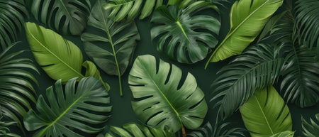 Dark green tropical leaves arranged beautifully. Lush vegetation creates a serene atmosphere.