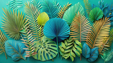 Colorful arrangement of various tropical leaves in vibrant shades of green, blue, and yellow, displayed against a teal-colored backdrop. The leaves are different sizes and shapes, creating a visually engaging composition. The leaves appear to be made of paper and have a 3D, or paper-cut, appearance.