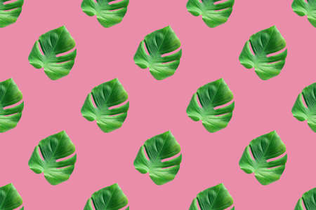 Summer tropical leaves pattern. Green leaf monstera seamless. Artistic photo collage for floral print. Pink background isolated. Concent for wallpaper, wrapping paper, ecolodgy.