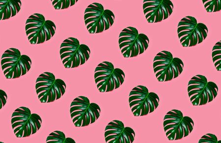 Green leaf monstera on a pink background. Heart shape. Pattern of hearts.
