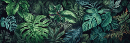Tropical plants texture background, panoramic floral pattern, generative AI. Scenery of tree leaves in the forest close-up. Concept of nature, foliage, wild, wilderness, wide banner.