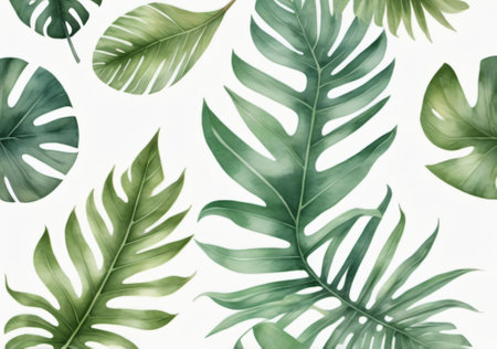 This image showcases a close-up view of vibrant green Monstera leaves with their distinctive patterns. The leaves are textured with a dark green coloration, creating a natural feel. The composition emphasizes the details of the plant life, ideal for various design and decorative purposes.