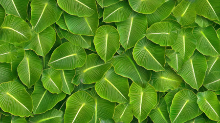 The photograph captures a dense arrangement of large, heart-shaped leaves with prominent central veins, characteristic of elephant ear plants. The varying shades of green and the overlapping foliage create a rich, textured, and vibrant botanical tapestry. The overall impression is one of lushness and natural abundance.