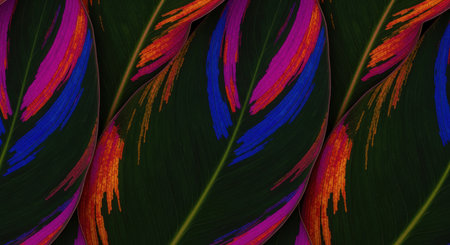 Colorful tropical leaves with vibrant neon streaks in pink, orange, and blue forming an abstract botanical pattern background.