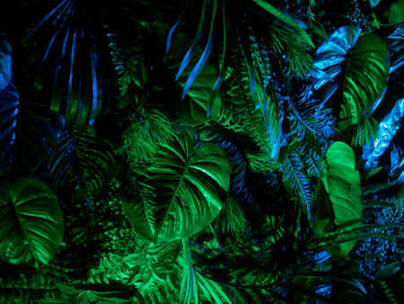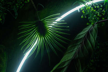 Neon lights in the dark tropical jungle. Night club concept.