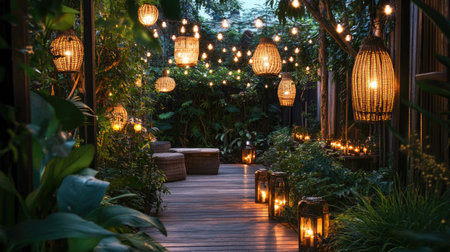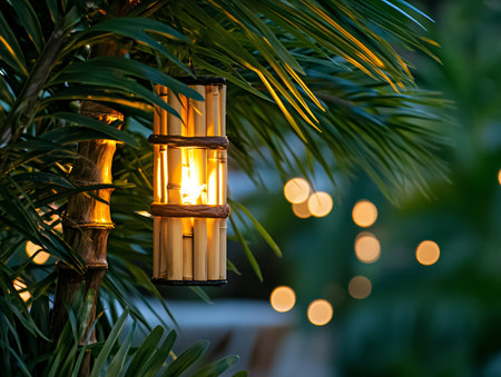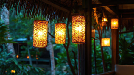 This image showcases beautifully woven bamboo lanterns illuminating a lush tropical environment at dusk, creating a cozy and inviting atmosphere perfect for relaxation.