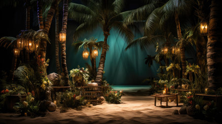 Tropical night scene with palm trees, wooden table and lanterns