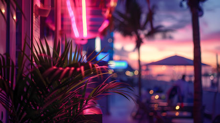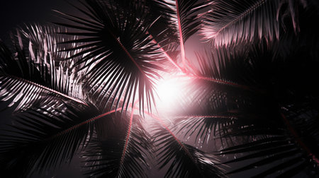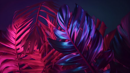 Neon glow illuminates palm leaves in a serene tropical twilight. ideal for design and atmosphere. A.I.