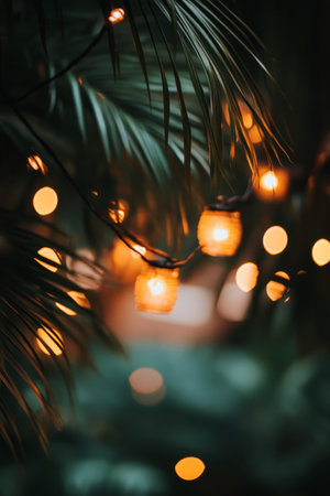 Festive lights twinkle against tropical leaves in a vibrant indoor setting during an evening gathering