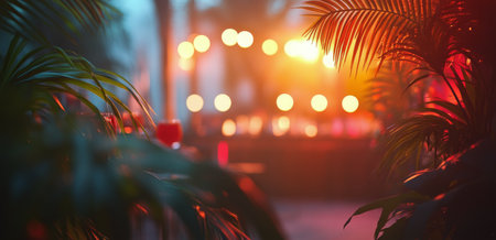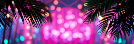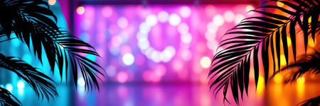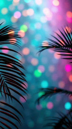 Colorful bokeh lights create a vibrant background with palm leaves in the foreground during a festive party atmosphere