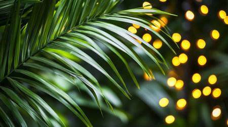 A stunning close-up of a palm leaf adorned with warm fairy lights, creating a cozy atmosphere. The soft green backdrop enhances the tropical elegance in this enchanting scene.