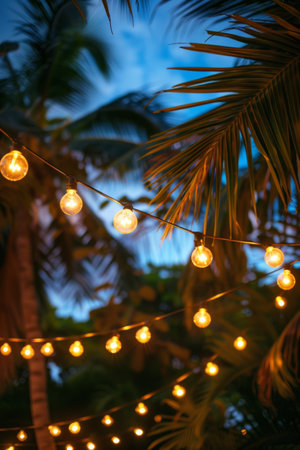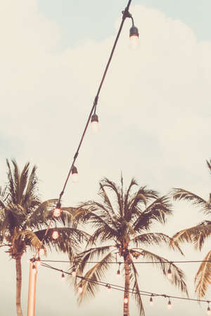 Trendy outdoor bulb garlands in tropical setting with palms in the background. Tropical evening setting, cozy holiday and event concept. Toned image with place for text