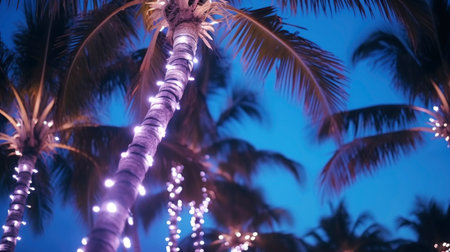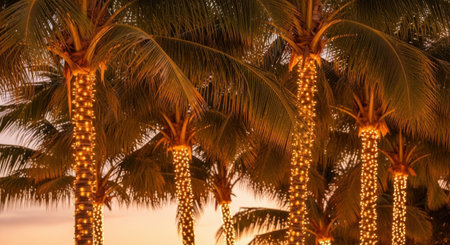 Tropical Twist on Christmas: Up Close Palm Trees Adorned with Twinkling Light Garlands and Golden Baubles
