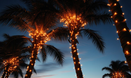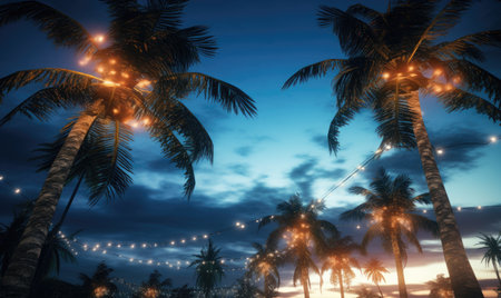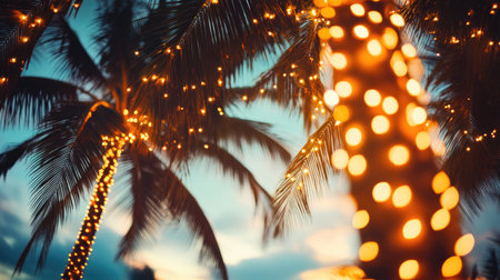 Tropical palm trees at sunset with festive fairy lights illuminating the evening sky