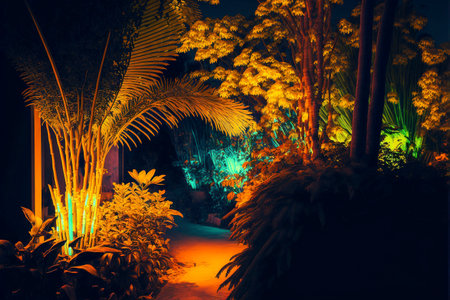 Soft lights illuminate lush green leaves in a tropical environment, enhancing the charm of the night. The warm glow invites relaxation and socialization in a serene atmosphere.
