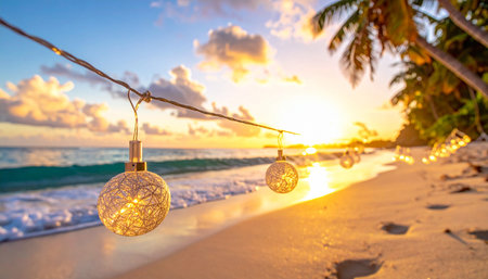 Christmas lights on the tropical beach at sunset time. Holiday concept.