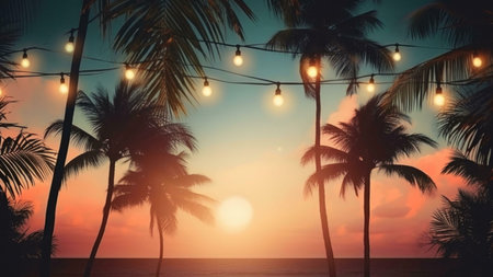 Silhouetted palm trees at sunset, string lights adding ambiance, peaceful tropical beach scene.