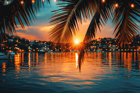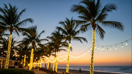 Warm lights hang between palm trees as the sun sets over the tranquil beach, casting a beautiful glow on the water and creating a serene atmosphere ideal for relaxation.