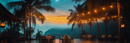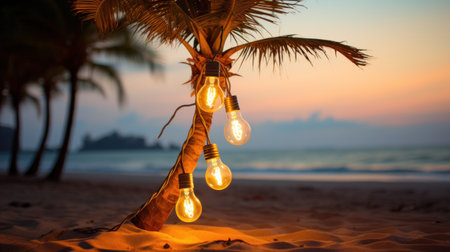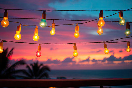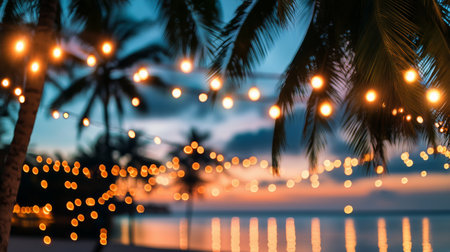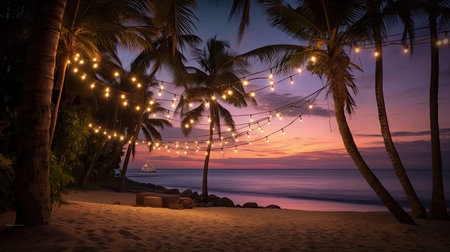 String lights illuminate a tropical beach at sunset. Warm colors and tranquil atmosphere.