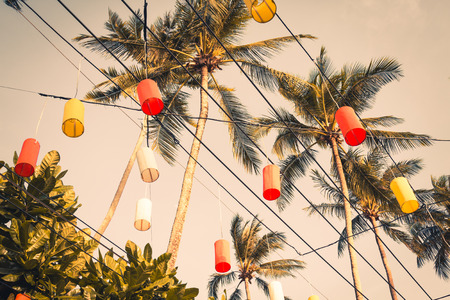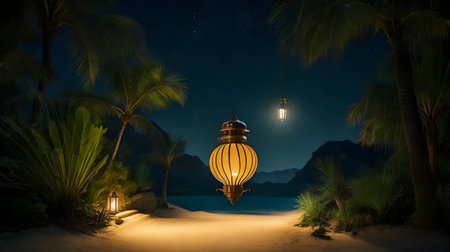 Beautifully crafted paper lanterns hang gracefully among palm trees, casting warm light in a serene tropical setting. The scene evokes a tranquil ambiance perfect for celebration.