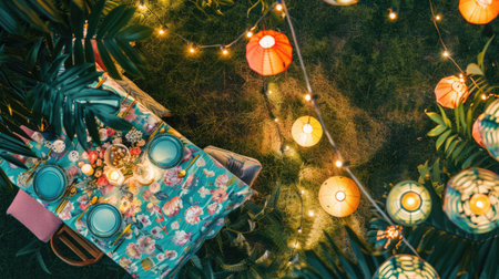 A serene scene featuring warm lanterns glowing amidst lush tropical leaves, creating an inviting atmosphere. Perfect for capturing summer evenings and outdoor gatherings.