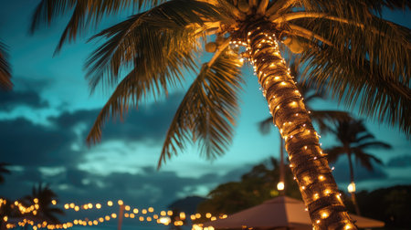 The tropical setting features vibrant palm leaves adorned with soft, glowing lights. The ambiance creates a tranquil and enchanting atmosphere in the evening, inviting relaxation.
