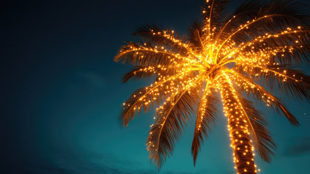 A palm tree beautifully lit up with warm fairy lights, glowing against a dark night sky, creating a tropical ambiance.