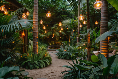 Lanterns decorating the garden with palm trees and plants