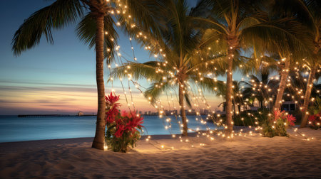 Christmas Palm Trees at the Beach: A Festive Scene. Concept Christmas Palm Trees, Tropical Holiday, Beach Decor, Festive Celebration
