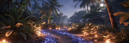 Glowing torches lighting a pathway through a tropical garden, casting a warm and welcoming light for evening strolls in paradise.