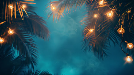 Tropical Night Summer Party Advertisement Background. Palm Trees, Light Bulb Garlands, and Spacious Text Area.