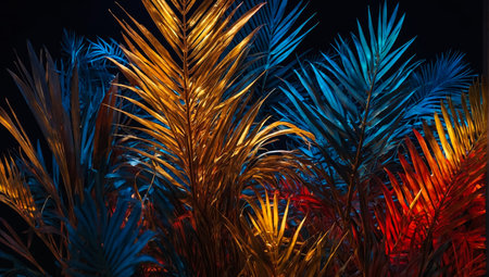 Dynamic closeup of tropical palm leaves with vivid red, yellow, and blue lighting. Nature meets art in an exotic spectacle, showcasing vibrant colors and lush foliage