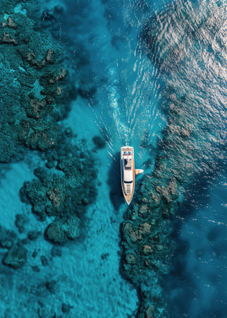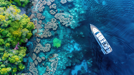 A bird's-eye perspective of a contemporary high-speed vessel sailing through the distant expanse of tropical water